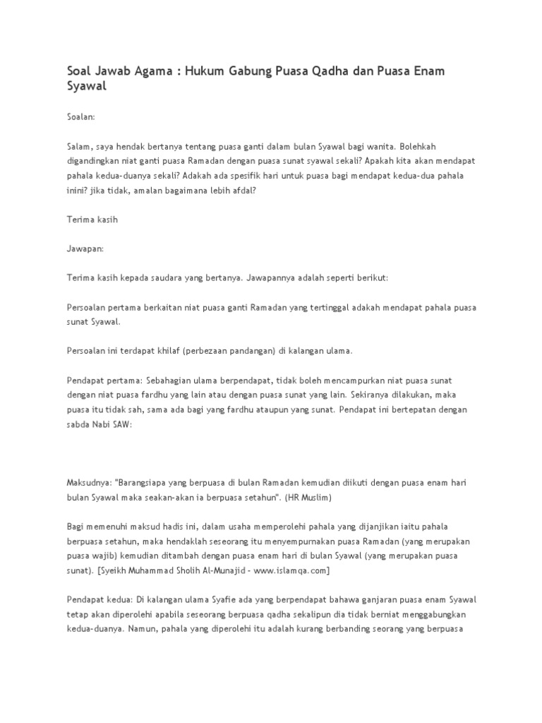 Hukum Qada Puasa Ramadhan Dengan Puasa 6 Syawal Cerita Tentang Shaklee Ajee from 1.bp.blogspot.com Namun, puasa ini memiliki sejumlah keutamaan. Puasa enam hari di bulan syawal setelah ramadhan masyru' (disyari'atkan). Puasa hari jum'at secara tersendiri, puasa awal tahun qibthi, puasa hari perayaan besar yang keduanya disendirikan tanpa ada puasa sebelumnya atau sesudahnya selama hal itu tidak bertepatan dengan kebiasaan, maka puasa itu dimakruhkan menurut tiga kelompok imam madzhab. Barangsiapa mengerjakan puasa enam hari bulan syawal selepas 'iedul fitri berarti ia telah menyempurnakan puasa setahun penuh. Barangsiapa yang telah melaksanakan puasa ramadhan, kemudian dia mengikutkannya dengan berpuasa selama 6 (enam) hari pada bulan syawal, maka dia. Lalu, sebenarnya bagaimana hukumnya dalam islam? Puasa sunnah artinya ada keutamaan jika dikerjakan. Jawaban rasulullah saw telah menjabarkan lewat sabda beliau: