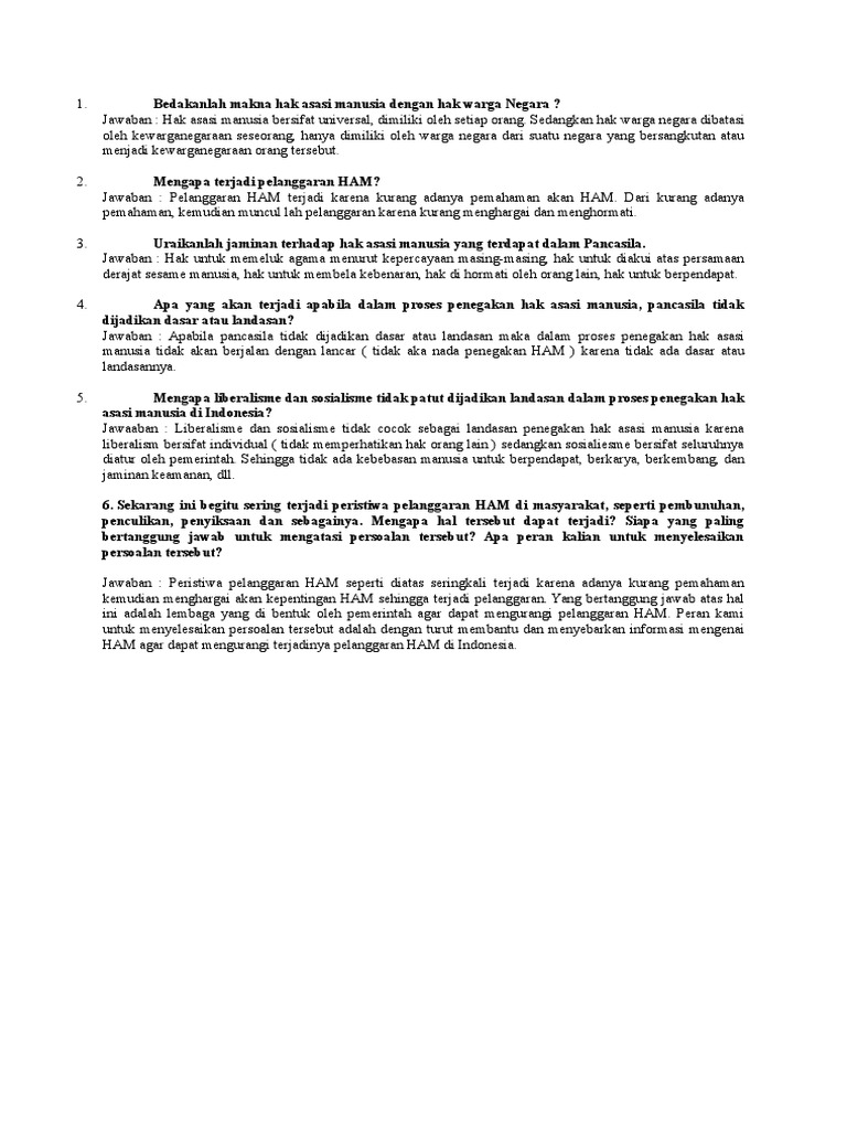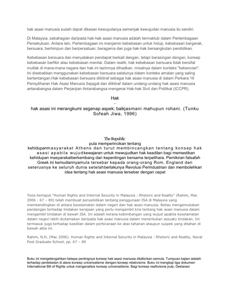 Hak asasi manusia memberi hak kepada orang untuk memilih cara mereka ingin hidup, bagaimana untuk menyatakan diri mereka dan jenis kerajaan yang mereka mahu menyokong, antara aspek lain. Falsafah ham deklarasi ham sejagat 1948 sejarah & perkemba ngan ham 1. Hak asasi manusia adalah penting kerana ia mencerminkan piawaian minimum yang diperlukan untuk hidup dengan maruah. Bab 1 napak tilas penegakan hak asasi manusia di indonesia. Mar 11, 2016 · menurut ajaran john locke hak asasi manusia meliputi: