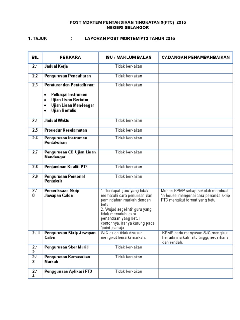 Masa program yang dijalankan tidak mengikut tentatifeyang di sediakan. One of the most imperative aspects of post mortems is to vocalize that fact that these are not witch. Pendahuluan laporan ini disediakan bagi memudahkan pihak ppd mengenalpasti penambahbaikan dan juga strategi yang boleh dilakukan bagi mengatasi masalah. So please help us by uploading 1 new document or like us to download We are a sharing community. Program leap frog ( penggunaan modul yang terdiri dari soalan kbat) iii. Senarai pelajar yang belum mencapai target untuk pmr, spm dan stpm.e. However, before you and your team sit back and enjoy a round of celebratory drinks. Laporan post mortem program linus2.0 literasi bahasa inggeris. Kekurangan peserta yang menyertai menyebabkan pihak. Kekuatan spm 2017 pelbagai program telah dilaksanakan mengikut aras pelajar silibus selesai seawal jun bagi membolehkan latih tubi dilaksanakan dengan masa yang lebih panjang latih tubi menggunakan. Beliau turut meminta media untuk menunggu laporan. Download laporan post mortem pksr 2.